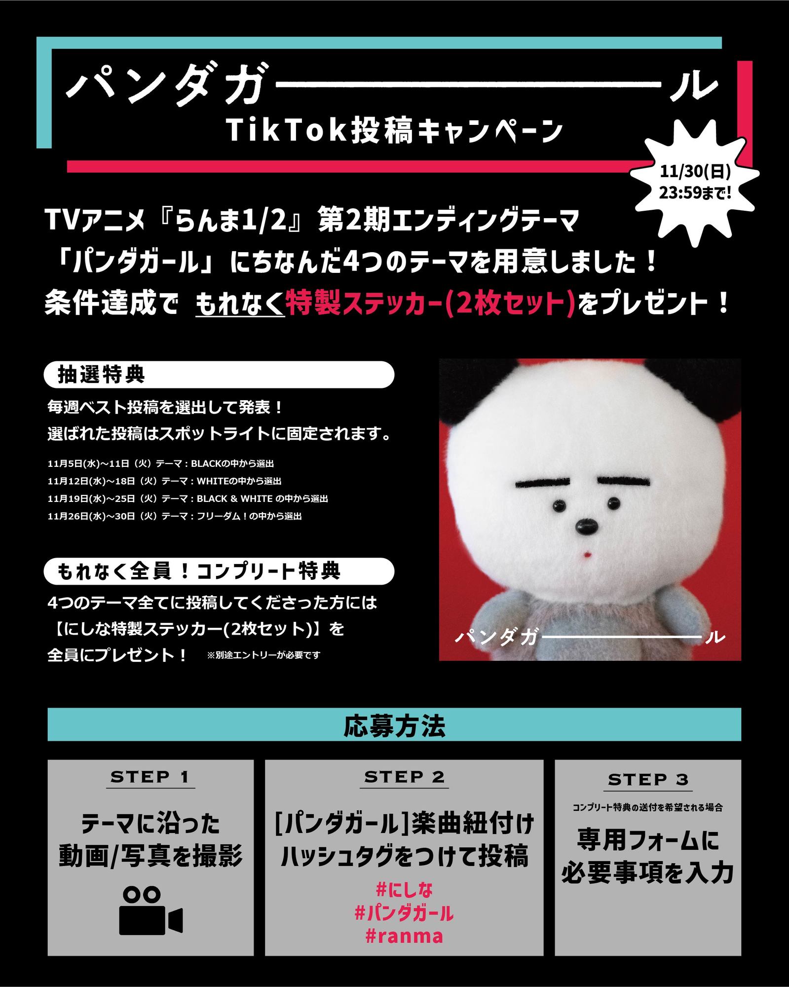 ②キャプションに「#にしな #パンダガール #ranma」のハッシュタグをつけ、TikTokに投稿。(投稿の際は「パンダガール」の公式音源を楽曲ライブラリより紐づけてください。)