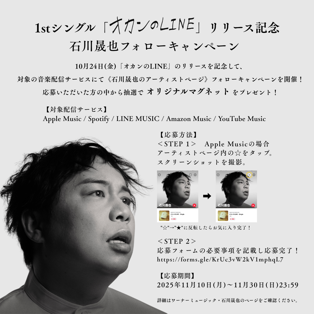 石川晟也「オカンのLINE」のリリースを記念してアーティストフォローキャンペーンを開催します!