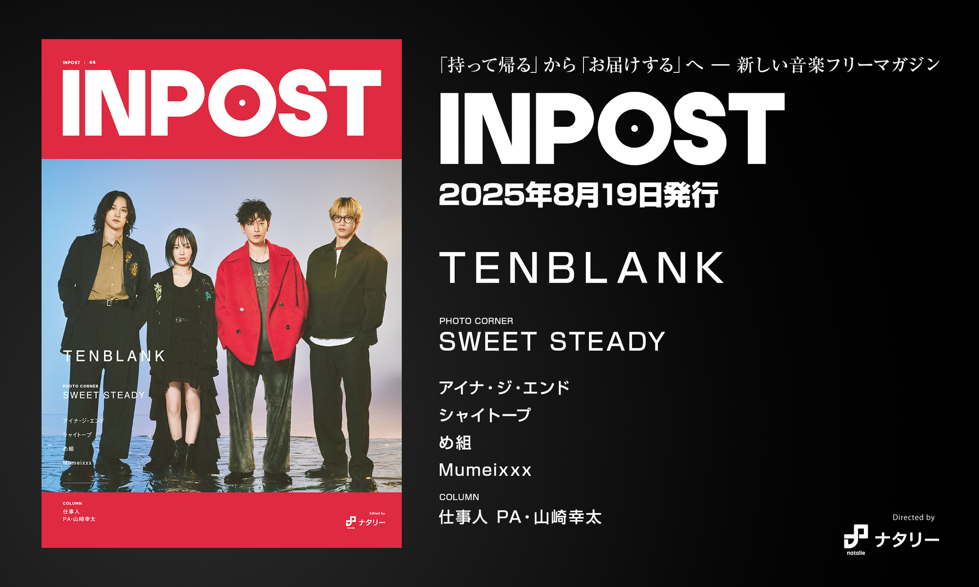 注目アーティストのインタビュー記事や新規撮りおろしのフォトコーナー、更には音楽業界の注目人物をご紹介する「仕事人(しごとびと)」など最新の音楽情報をナタリーが一冊にまとめた音楽フリーマガジン『INPOST』が2025年8月19日(火)以降、下記をはじめとする対象のCD商品をご購入いただいた方へCDと一緒にお届けいたします。