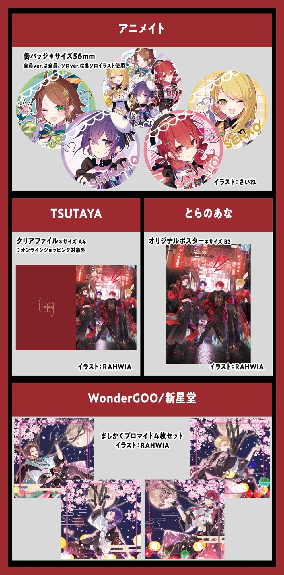 トップディスコグラフィーニュースプロフィールビデオ浦島坂田船トップニュースNew Album「WARN12G」購入者特典絵柄公開NewsNew Album「WARN12G」購入者特典絵柄公開2025.6.5Tweet ALBUMCD+DVDWARN12G 初回限定盤A (浦島坂田船ver.)2025.06.25 発売 ¥3,080(税込)/WPZL-32211/2浦島坂田船WARN12G 初回限定盤A (浦島坂田船ver.)ALBUMCD+DVD2025.06.25 発売 ¥3,080(税込)/WPZL-32211/2BuyDownloadStreamingALBUMCD+DVDWARN12G 初回限定盤B (うらたぬきver.)2025.06.25 発売 ¥3,080(税込)/WPZL-32213/4浦島坂田船WARN12G 初回限定盤B (うらたぬきver.)ALBUMCD+DVD2025.06.25 発売 ¥3,080(税込)/WPZL-32213/4BuyDownloadStreamingALBUMCD+DVDWARN12G 初回限定盤C (志麻ver.)2025.06.25 発売 ¥3,080(税込)/WPZL-32215/6浦島坂田船WARN12G 初回限定盤C (志麻ver.)ALBUMCD+DVD2025.06.25 発売 ¥3,080(税込)/WPZL-32215/6BuyDownloadStreamingALBUMCD+DVDWARN12G 初回限定盤D (となりの坂田。ver.)2025.06.25 発売 ¥3,080(税込)/WPZL-32217/8浦島坂田船WARN12G 初回限定盤D (となりの坂田。ver.)ALBUMCD+DVD2025.06.25 発売 ¥3,080(税込)/WPZL-32217/8BuyDownloadStreamingALBUMCD+DVDWARN12G 初回限定盤E (センラver.)2025.06.25 発売 ¥3,080(税込)/WPZL-32219/20浦島坂田船WARN12G 初回限定盤E (センラver.)ALBUMCD+DVD2025.06.25 発売 ¥3,080(税込)/WPZL-32219/20BuyDownloadStreamingALBUMCDWARN12G 通常盤2025.06.25 発売 ¥2,200(税込)/WPCL-13657浦島坂田船WARN12G 通常盤ALBUMCD2025.06.25 発売 ¥2,200(税込)/WPCL-13657BuyDownloadStreaming一覧にもどる