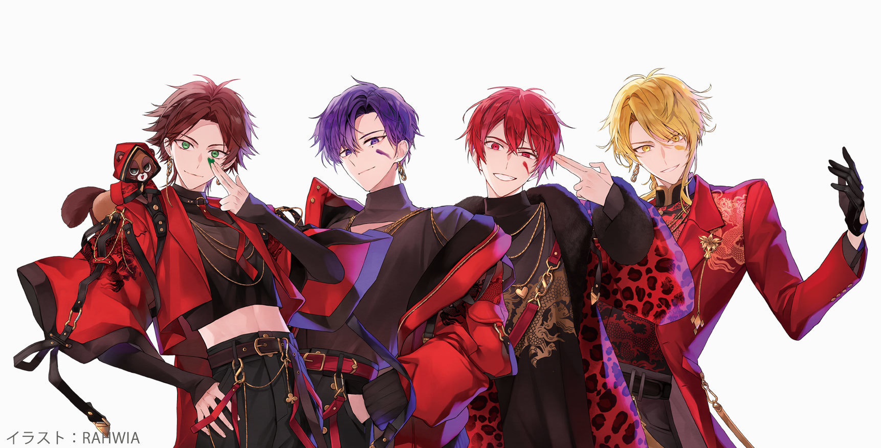 うらたぬき(イメージカラー:緑)、志麻(イメージカラー:紫)、となりの坂田。(イメージカラー:赤)、センラ(イメージカラー:黄)の4名から成る男性ボーカルユニット。 *L→R