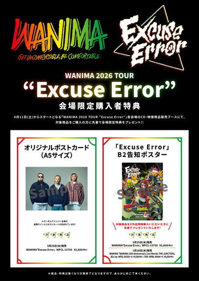 4月11日(土)からスタートとなる「WANIMA 2026 TOUR ”Excuse Error”」各会場のCD・映像商品販売ブースにて、対象商品をご購入の方に先着で会場限定特典をプレゼント!!